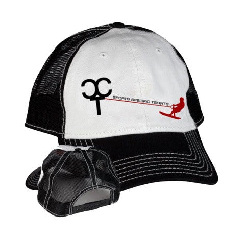 Unstructured Soft Crown Low-Fitting Mens Waterskiing Hat / Womens Waterskiing Hat 6-Panel cap Seamed Front Panel without Buckram 6 Embroidered Eyelets Pro Stitch on Crown 6 Rows Stitching on Visor Matching Fabric Undervisor Matching Color Sweatband Adjustable Plastic Snap 1 size fits most Black, White, and Red Logo in Black and Red with Waterskier 100% Cotton Front 100% Polyester Back